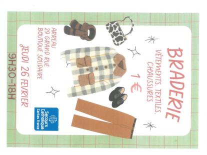 Braderie vêtements, textiles, chaussures à 1€ au secours catholique d'Arreau de 9h30 à 18h.